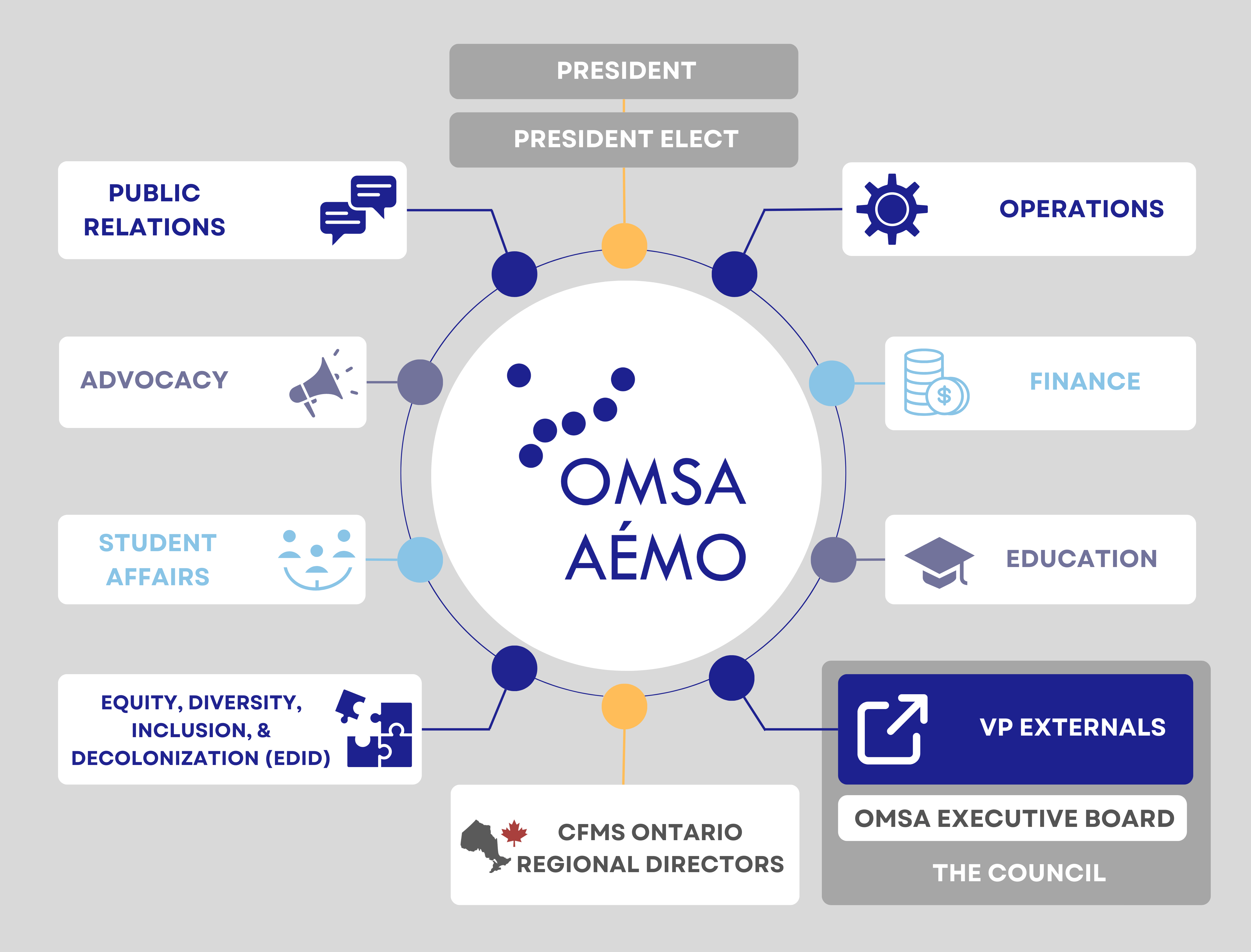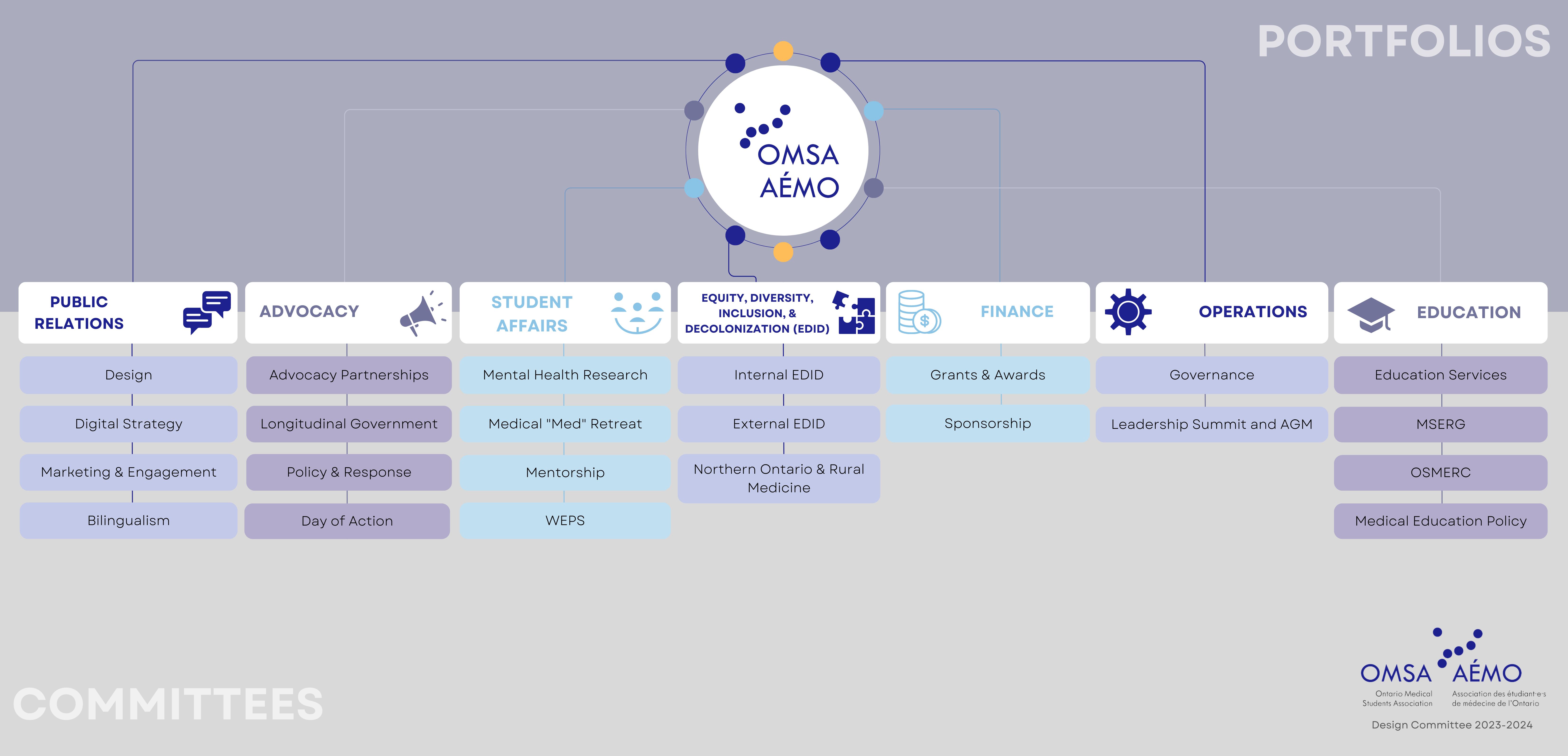 OMSA’s council is made up of 21 members. The President, the President-Elect, and seven portfolio directors compose the new 9-member Executive Board. The remaining 12 members are VP Externals, of which there are two (one senior and one junior) from each Ontario Medical School. Additionally, each of the 7 portfolios has a number of committees with chairs and general members. Click below to learn more: